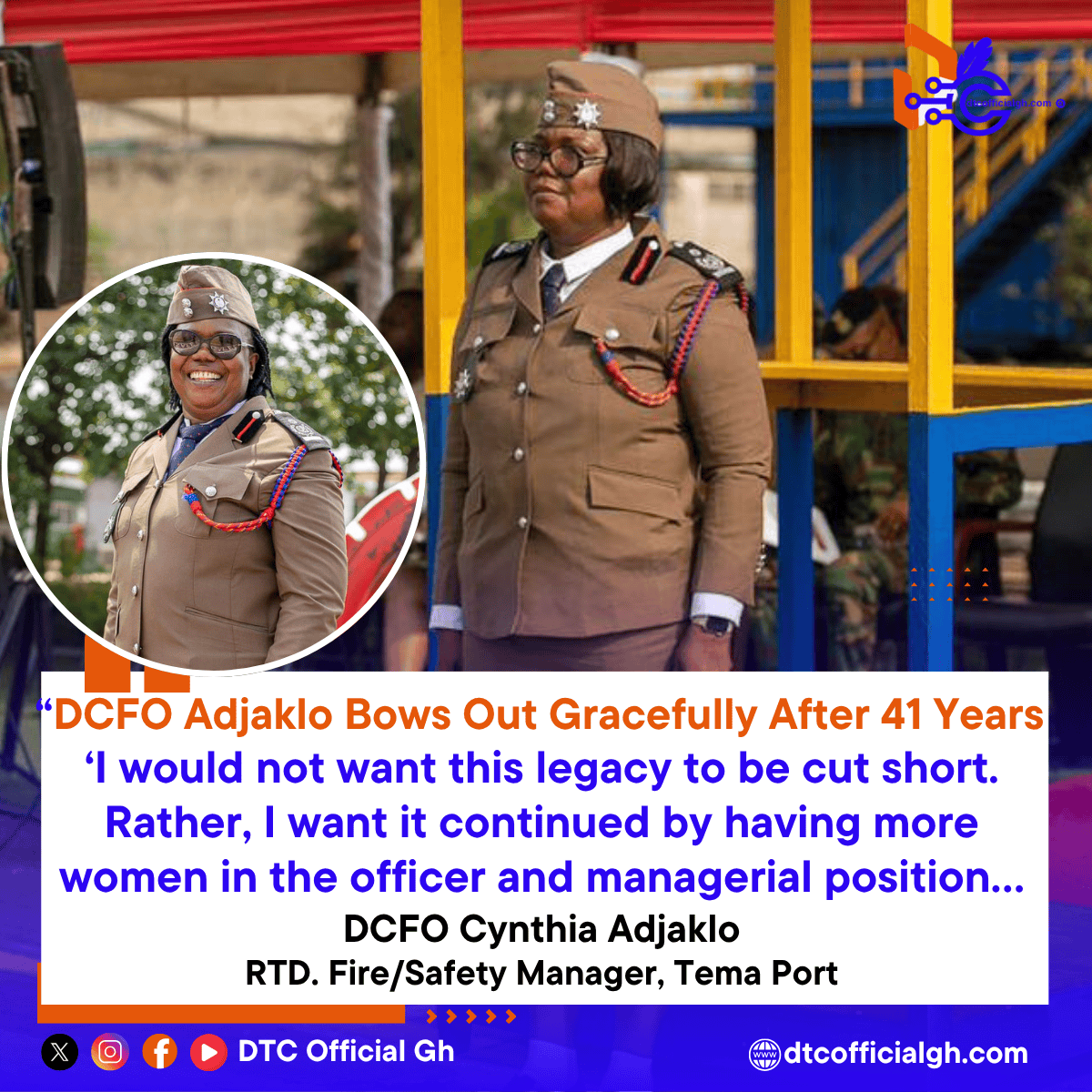 In an emotional and inspiring pullout parade held yesterday at the Port of Tema, Deputy Chief Fire Officer (DCFO) Cynthia Aba Adjaklo, the first female Manager of the Ghana Ports and Harbours Authority (GPHA) Fire and Safety Department, officially retired after 41 years of dedicated service.