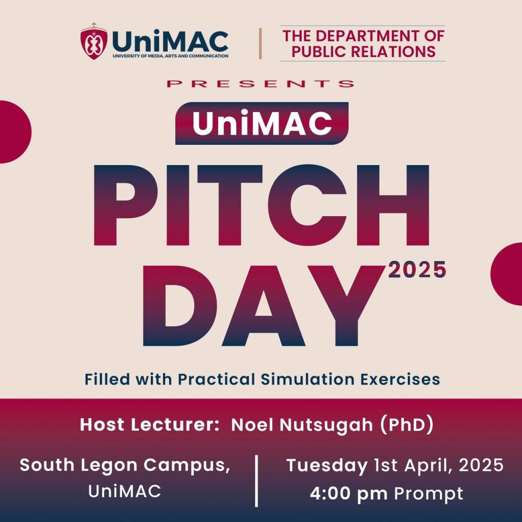 The UniMAC Pitch Day 2025, an event organized by the University of Media, Arts, and Communication (UniMAC) Department of Public Relations, is set to take place on Tuesday, April 1, 2025, at the South Legon Campus. This highly anticipated event, featuring Dr. Noel Nutsugah as the host lecturer, will be filled with practical simulation exercises, providing a platform for student organizations to showcase innovative public relations and corporate communication campaigns.